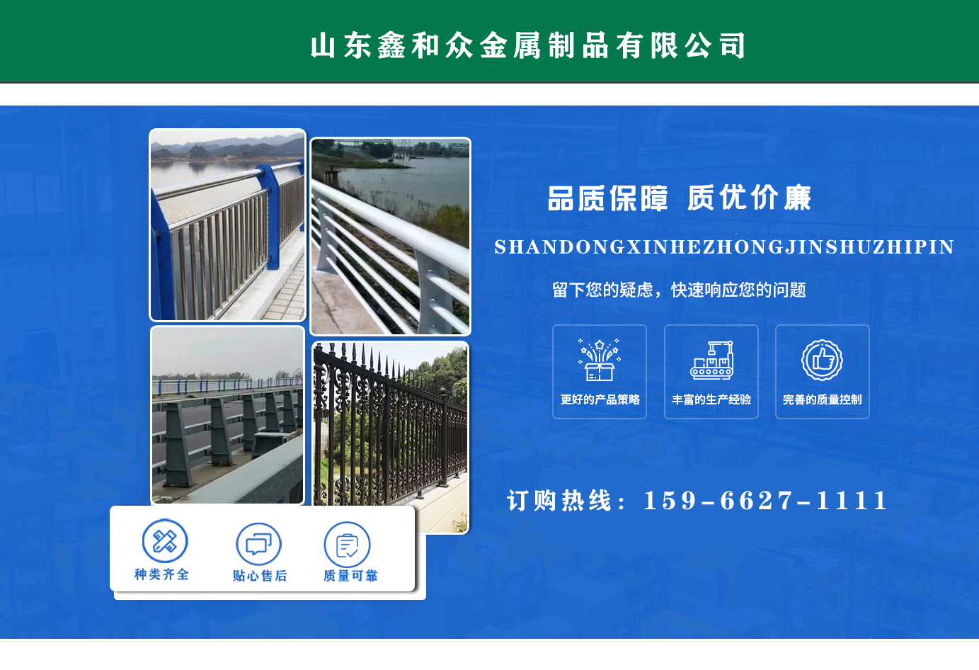 山東鑫和眾金屬制品有限公司主要產(chǎn)品有防撞護(hù)欄,橋梁護(hù)欄,道路護(hù)欄,河道護(hù)欄,不銹鋼護(hù)欄等護(hù)欄。提供設(shè)計(jì)方案,一站式定制,包您滿(mǎn)意價(jià)格優(yōu)惠,歡迎來(lái)電咨詢(xún)!    公司常年從事銷(xiāo)售護(hù)欄防撞護(hù)欄,橋梁護(hù)欄,道路護(hù)欄,河道護(hù)欄,不銹鋼護(hù)欄,橋梁鋼護(hù)欄,河道燈光護(hù)欄等。產(chǎn)品廣泛應(yīng)用于橋梁、河道、旅游景區(qū)、道路、公路、公園、小區(qū)、景觀、道路防撞等領(lǐng)域。    公司產(chǎn)品均采用優(yōu)質(zhì)不銹鋼材料,符合相關(guān)標(biāo)準(zhǔn)。各種型號(hào)不銹鋼復(fù)合管及護(hù)欄,質(zhì)量嚴(yán)格把控。產(chǎn)品強(qiáng)度高、耐腐蝕、焊接牢固、抗沖擊、性能好,防撞護(hù)欄結(jié)構(gòu)簡(jiǎn)單、美觀實(shí)用大方。     歡迎前來(lái)訂購(gòu)!...